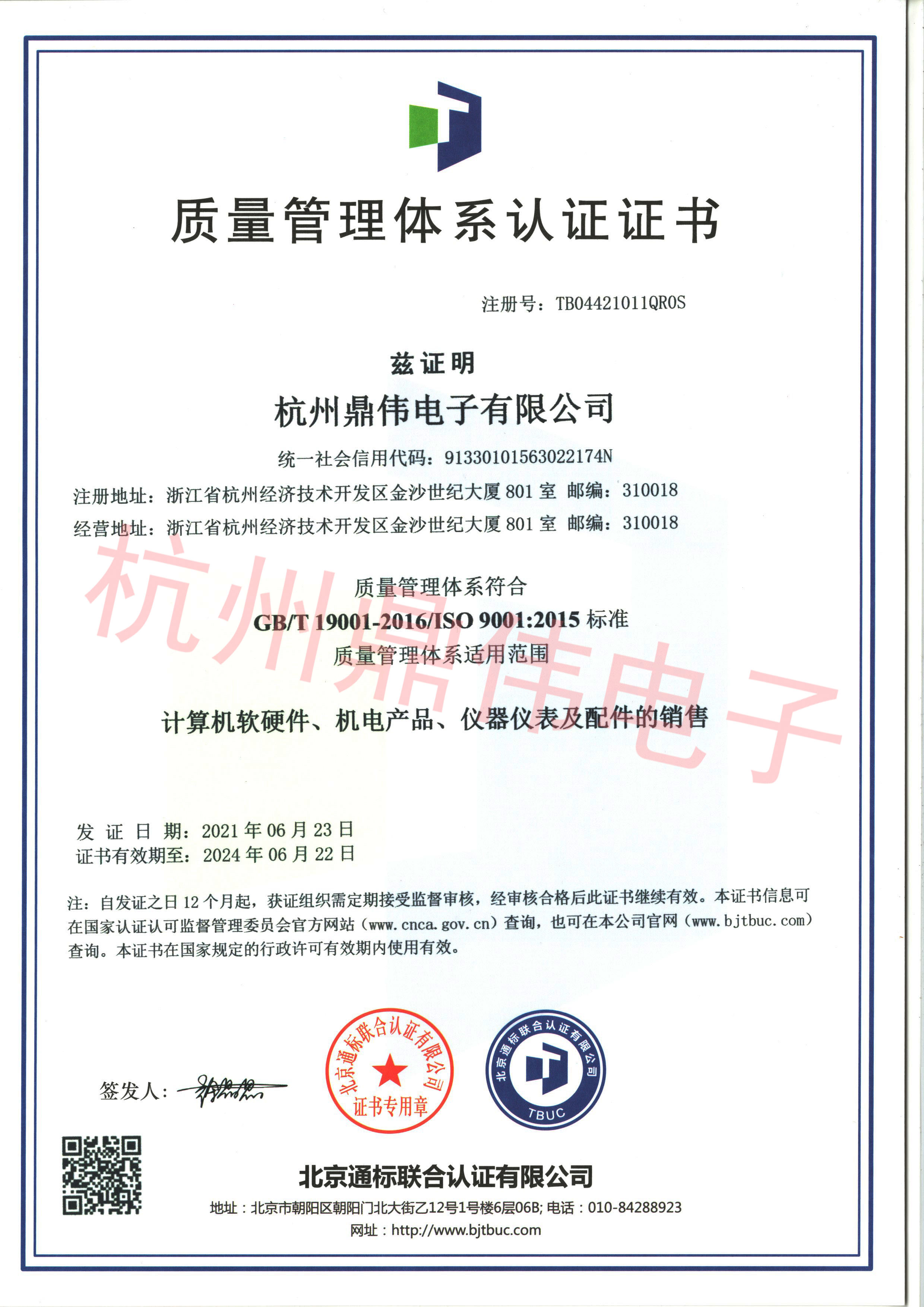 杭州鼎偉電子有限公司已于2018年9月28日正式獲得ISO 9001:2015質量管理體系認證證書,并連續6年被正式授權為羅德與施瓦茨和日本橫河的浙江獨家代理商,2019年又榮獲臺灣chroma浙江地區一級代理商等等。